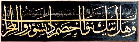 “Ve hel etâke nebe’ü’l-hasmi iz tesevveru’l-mihrâb. İz dehalû alâ Dâvûde fe-fezi’a minhüm kâlû lâ tehaf. Hasmâni beğâ ba’zunâ alâ ba’zin fahküm beynenâ bi’l-hakki”