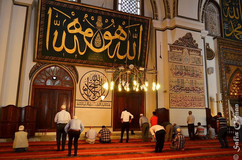 Mihrap, Bursa kadısı Mevlana Emir Hasan tarafından kıbleye dönük olmadığı gerekçesiyle yıktırılmış, ancak 1561'de yeniden eski haline döndürülmüş, nakışları da Nakkaş Mehmed tarafından elden geçirilmiştir. 1572 ve 1855 tarihlerinde nakışlar tekrar yenilenmiş, tezyinatını Tevfik Paşa gerçekleştirmiştir. Müezzin mahfili, 1549'da Mustafa Efendi tarafından yaptırılmıştır. Sert ceviz ağacından sekiz sütun üzerine inşa edilen mahfil, sade ve zarif bir görünüme sahiptir. Üzerinde Bursalı şair Rahmî’ye ait bir yazı bulunmaktadır. Mahfilin hemen solunda, 1815'te yapılan mermer bir taş kürsü bulunmaktadır. Camide Molla Gürânî tarafından yaptırılan kürsü de dahil olmak üzere başka kürsüler de vardı; fakat bu kürsüler bugün mevcut değildir.
